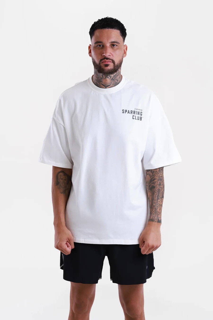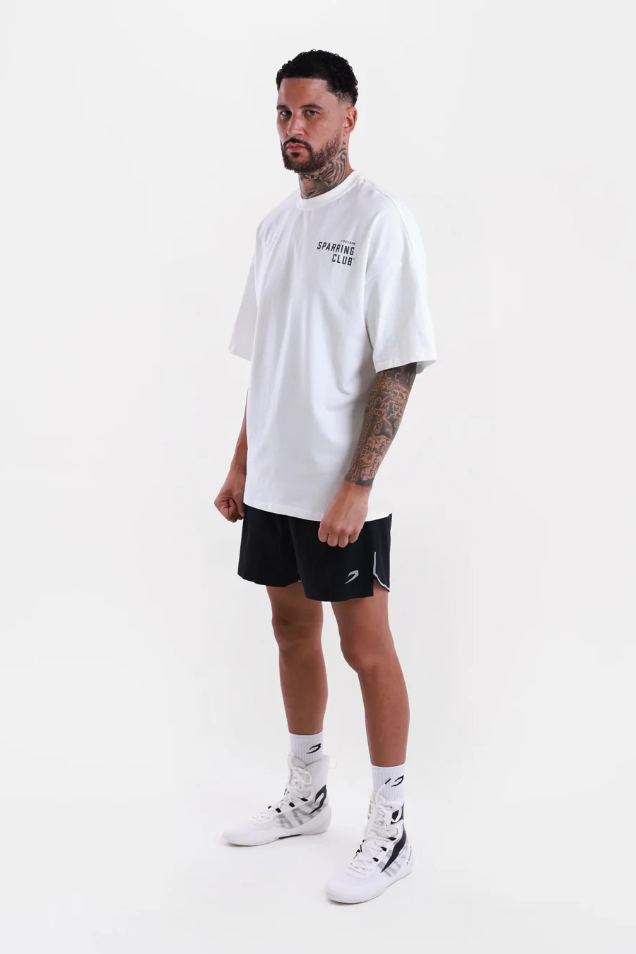 На фото в белом и темно-сером Тай Митчелл - профессиональный боксер суперсредневесе ростом 193 см, размер одежды L.