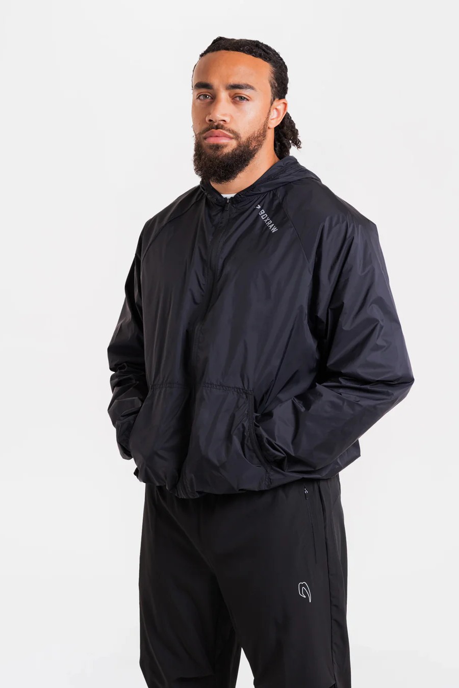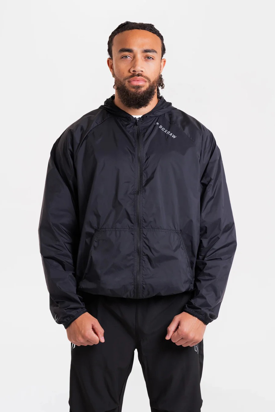 На фото в черном Си Джей - профессиональный боксер в полусреднем весе ростом 180 см. Размер одежды M.