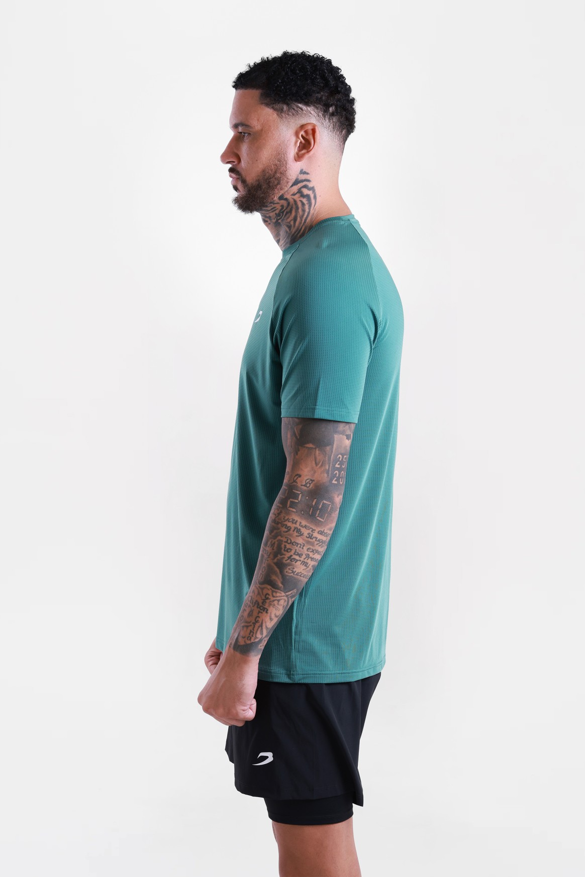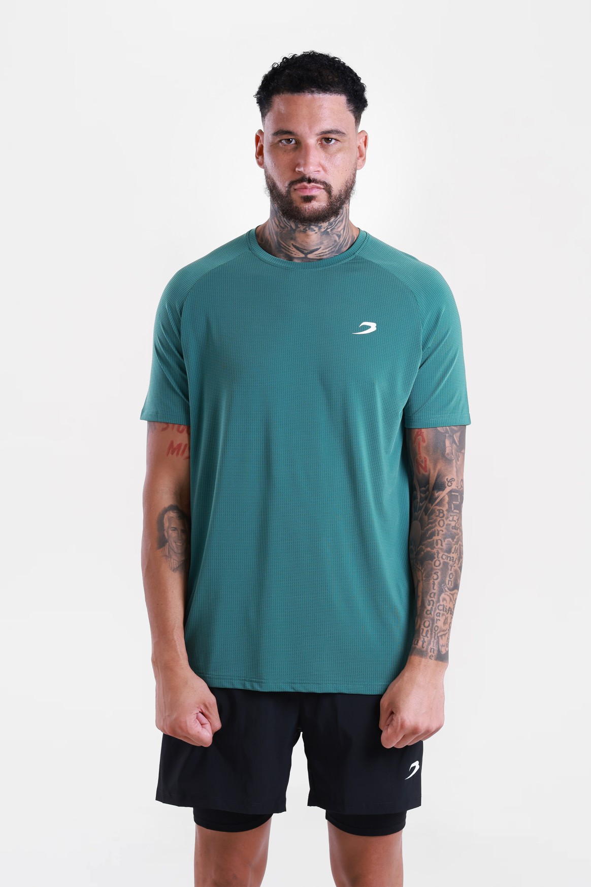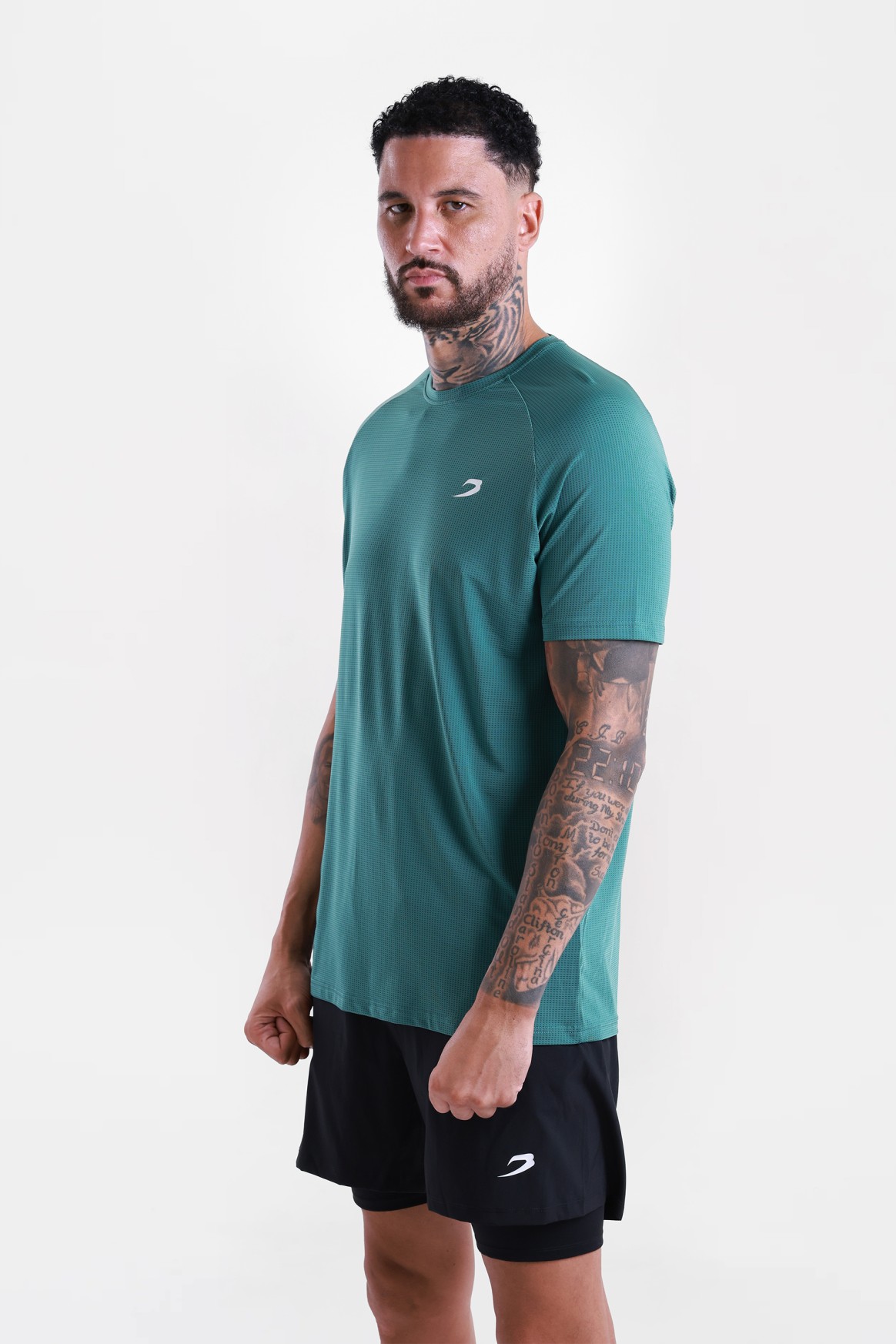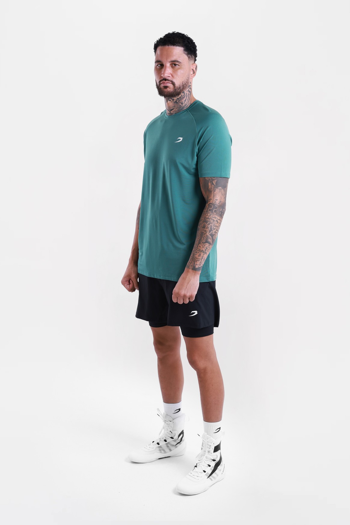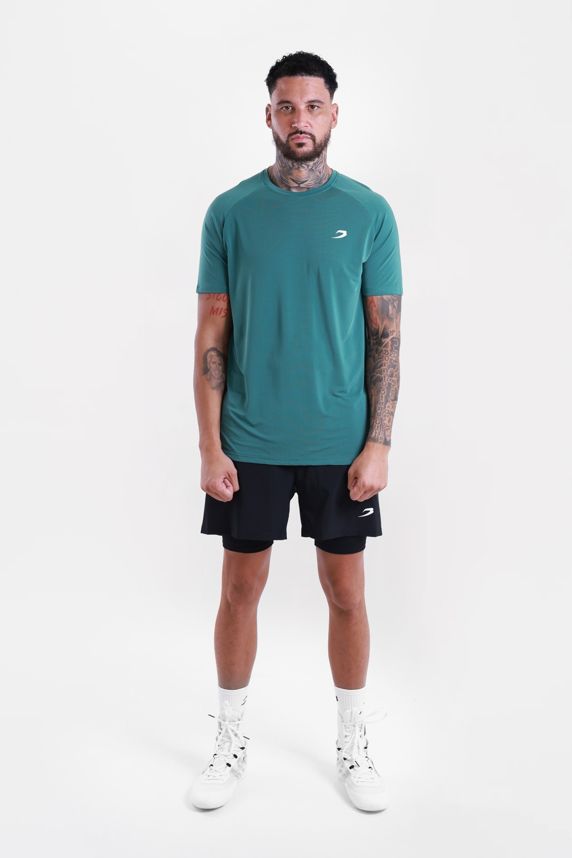 На фото в черной, красной и зеленой футболке позирует Эзра - профессиональный боксер в тяжелом весе ростом 188 см, размер одежды L.
