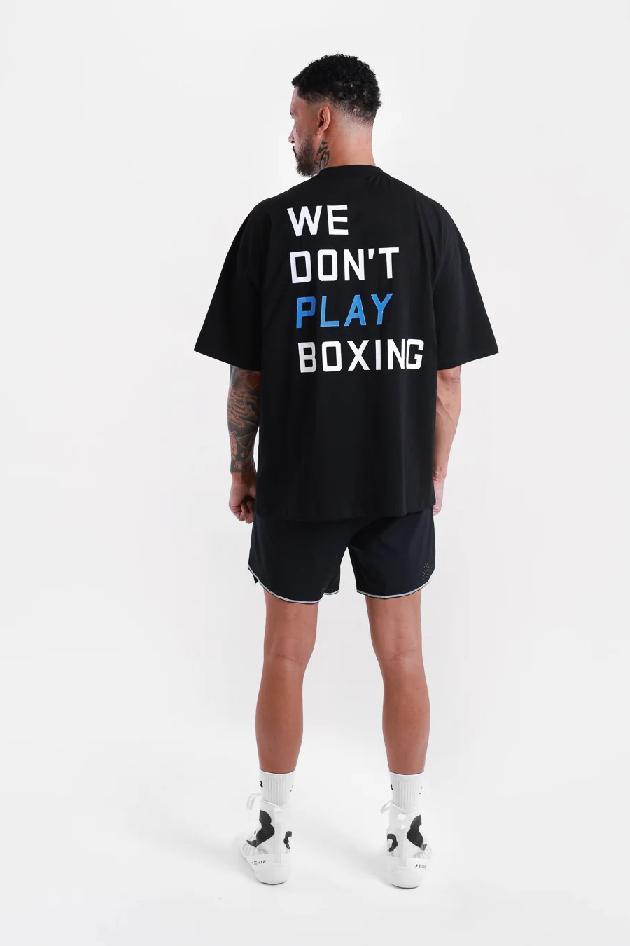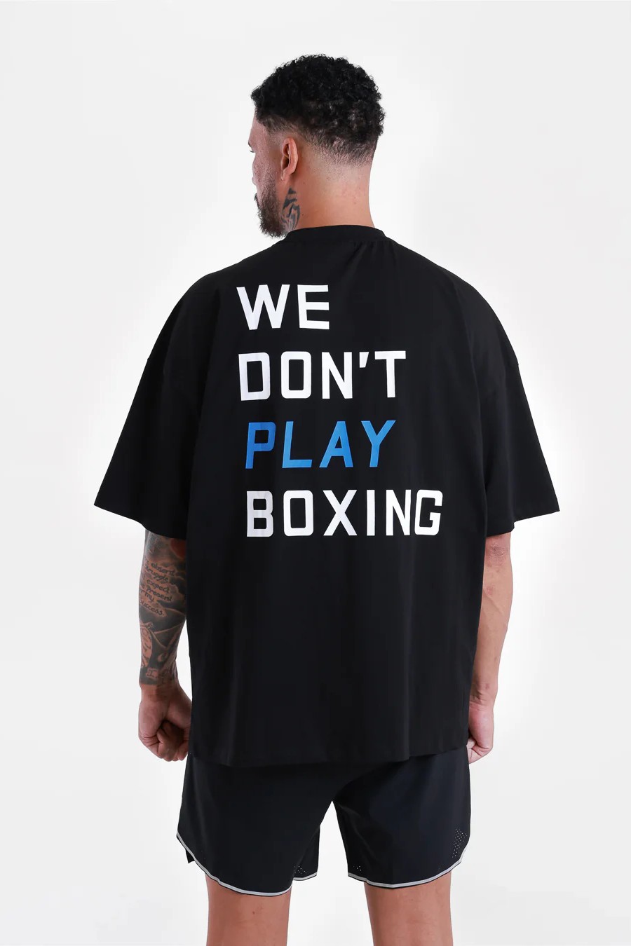 Самый жестокий из видов спорта. Вредный бизнес. У бокса много ярлыков. Но в сообществе хорошо известно, что вы можете играть в футбол, баскетбол и другие виды спорта, но вы не можете играть в бокс. Эта футболка кроя оверсайз с нашим фирменным слоганом WE DON'T PLAY BOXING ®️ на спине служит напоминанием миру об этом факте и сопровождает вас на протяжении раундов день за днем.