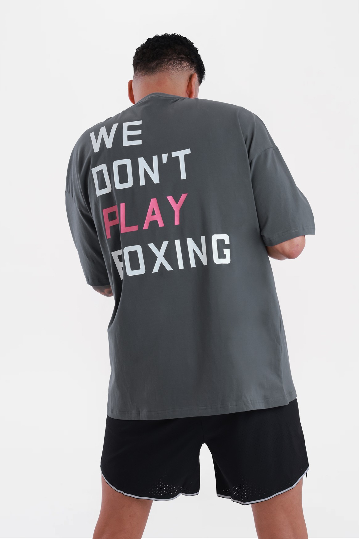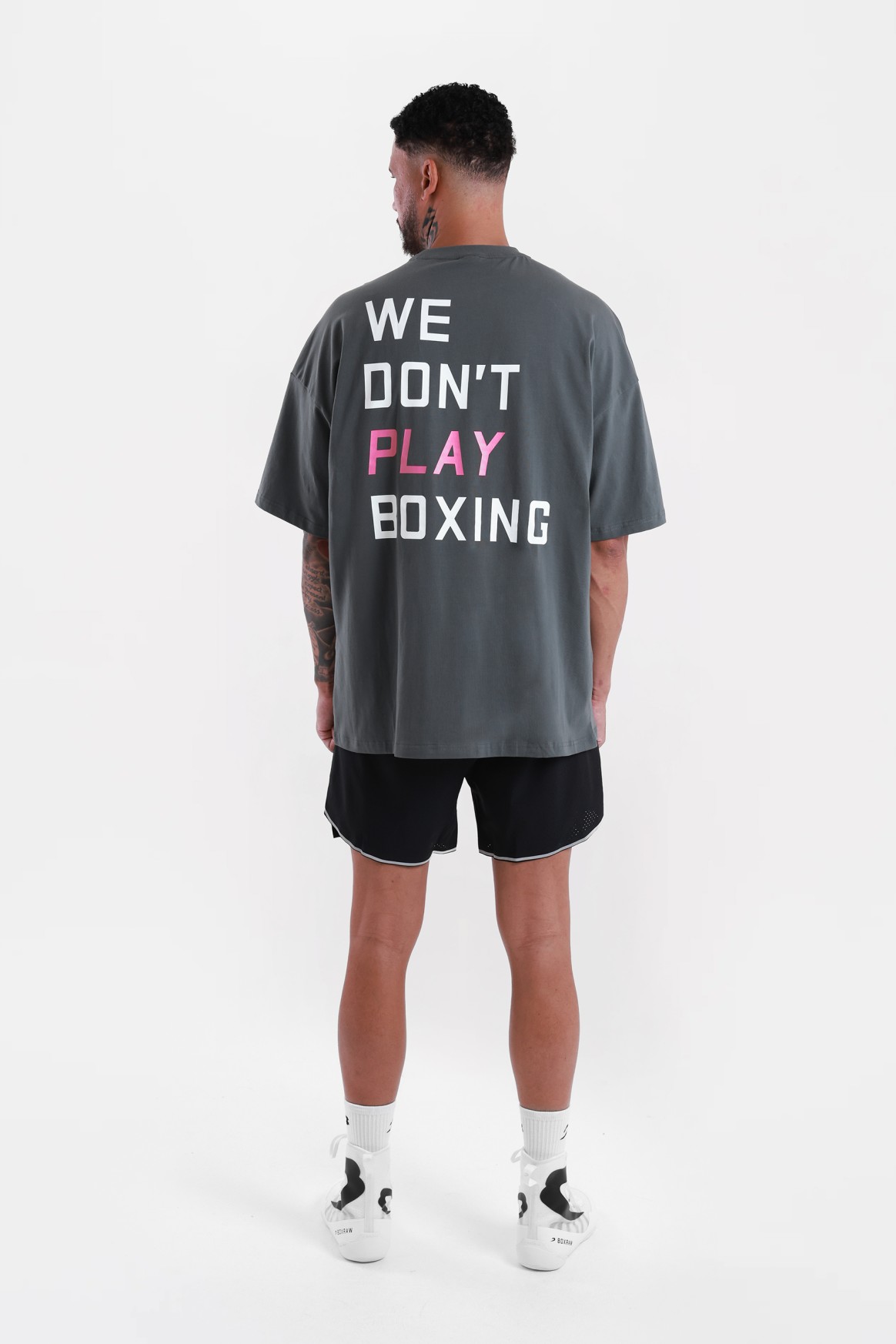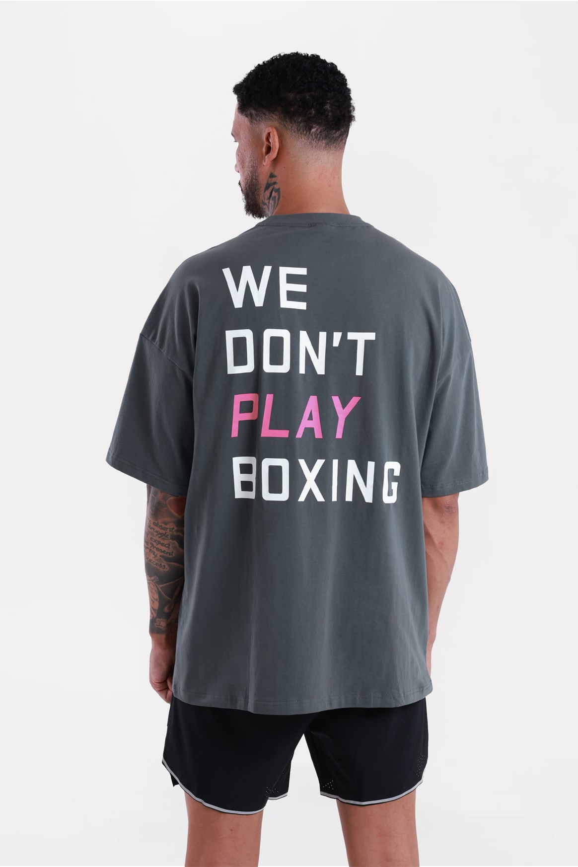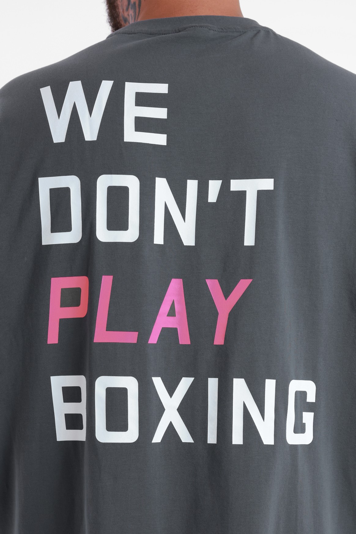 Самый жестокий из видов спорта. Вредный бизнес. У бокса много ярлыков. Но в сообществе хорошо известно, что вы можете играть в футбол, баскетбол и другие виды спорта, но вы не можете играть в бокс. Эта футболка кроя оверсайз с нашим фирменным слоганом WE DON'T PLAY BOXING ®️ на спине служит напоминанием миру об этом факте и сопровождает вас на протяжении раундов день за днем.