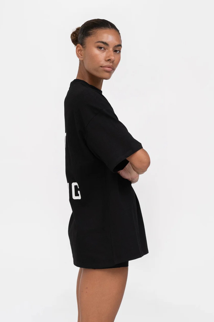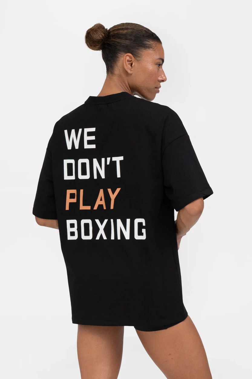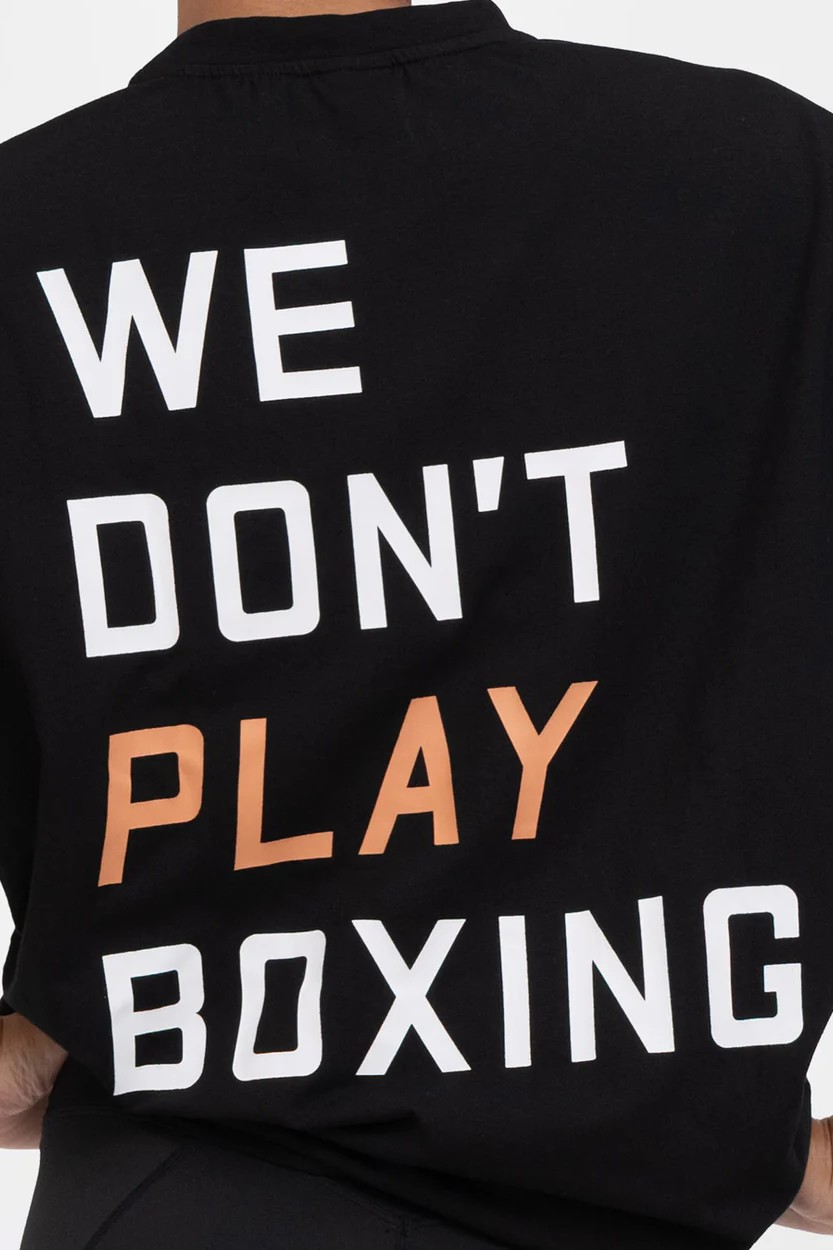 Самый жестокий из видов спорта. Вредный бизнес. У бокса много ярлыков. Но в сообществе хорошо известно, что вы можете играть в футбол, баскетбол и другие виды спорта, но вы не можете играть в бокс. Эта футболка кроя оверсайз с нашим фирменным слоганом WE DON'T PLAY BOXING ®️ на спине служит напоминанием миру об этом факте и сопровождает вас на протяжении раундов день за днем.