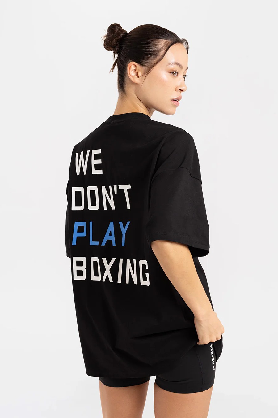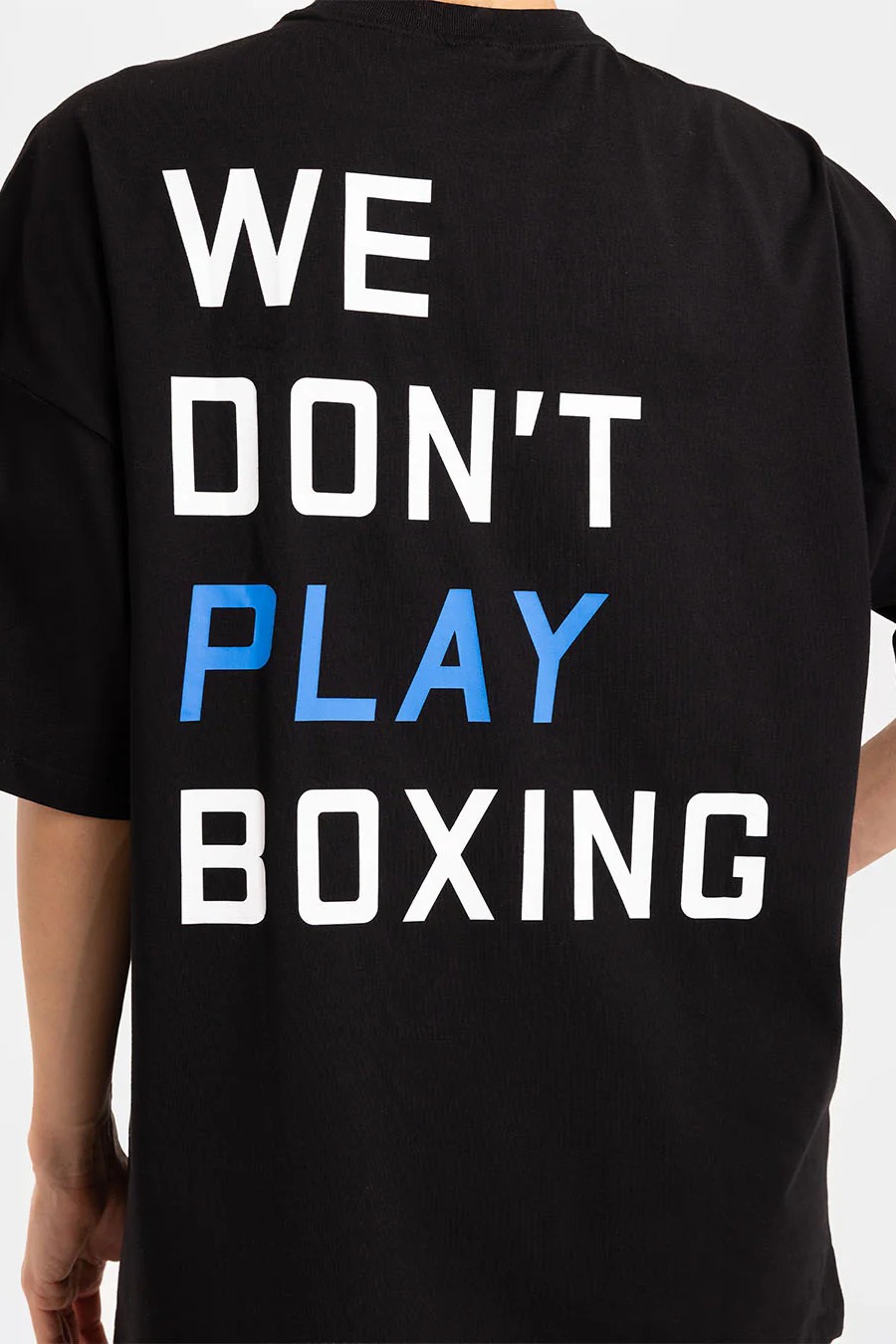 Самый жестокий из видов спорта. Вредный бизнес. У бокса много ярлыков. Но в сообществе хорошо известно, что вы можете играть в футбол, баскетбол и другие виды спорта, но вы не можете играть в бокс. Эта футболка кроя оверсайз с нашим фирменным слоганом WE DON'T PLAY BOXING ®️ на спине служит напоминанием миру об этом факте и сопровождает вас на протяжении раундов день за днем.