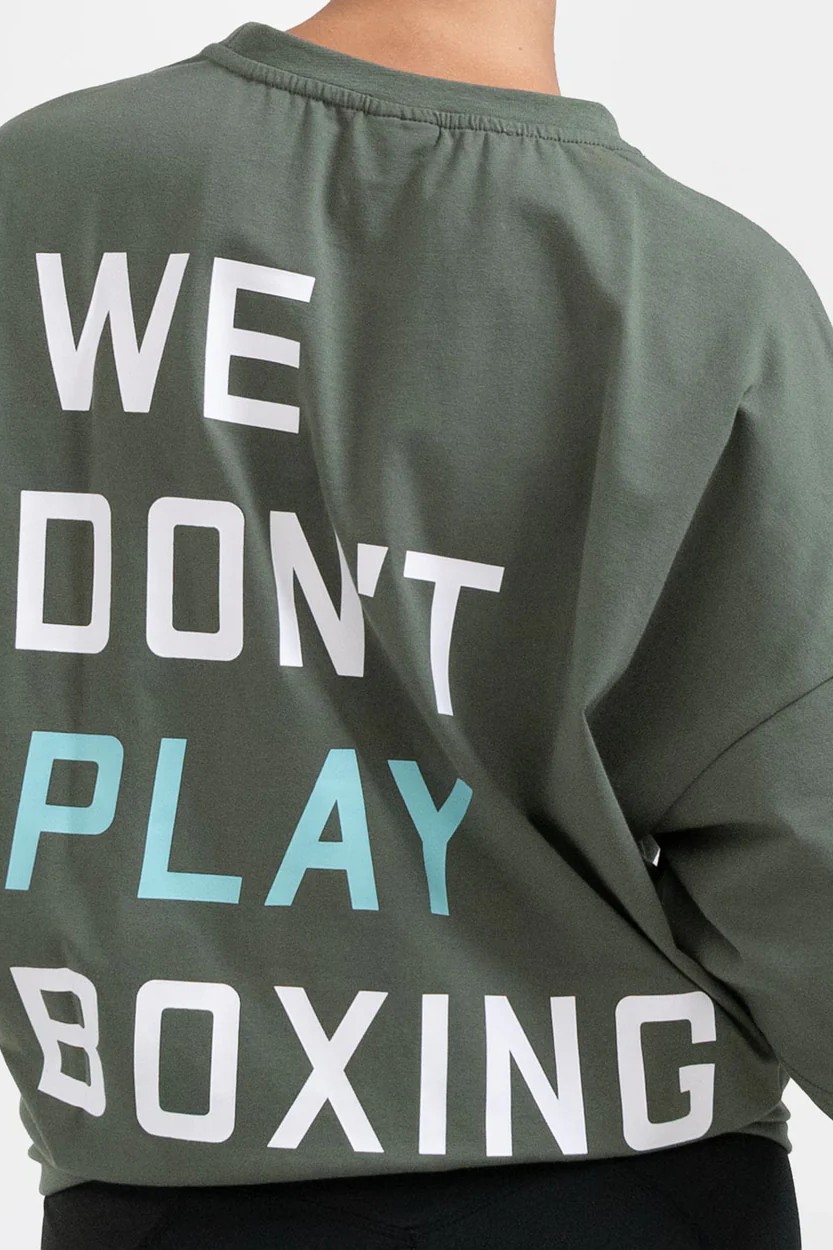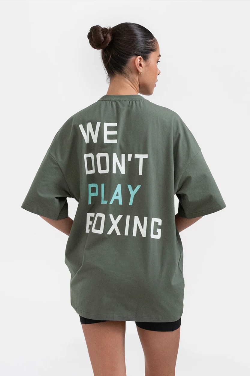 Самый жестокий из видов спорта. Вредный бизнес. У бокса много ярлыков. Но в сообществе хорошо известно, что вы можете играть в футбол, баскетбол и другие виды спорта, но вы не можете играть в бокс. Эта футболка кроя оверсайз с нашим фирменным слоганом WE DON'T PLAY BOXING ®️ на спине служит напоминанием миру об этом факте и сопровождает вас на протяжении раундов день за днем.