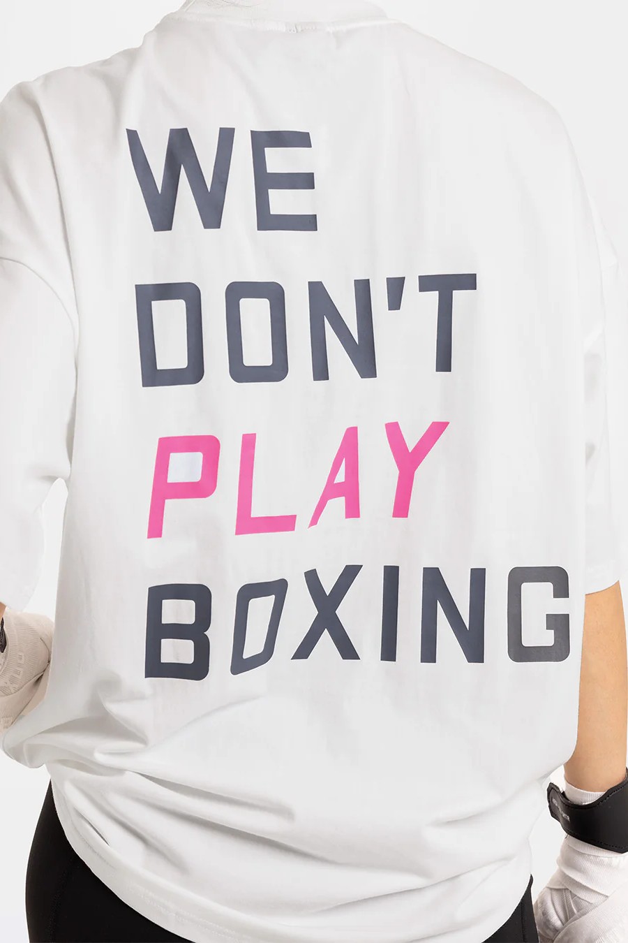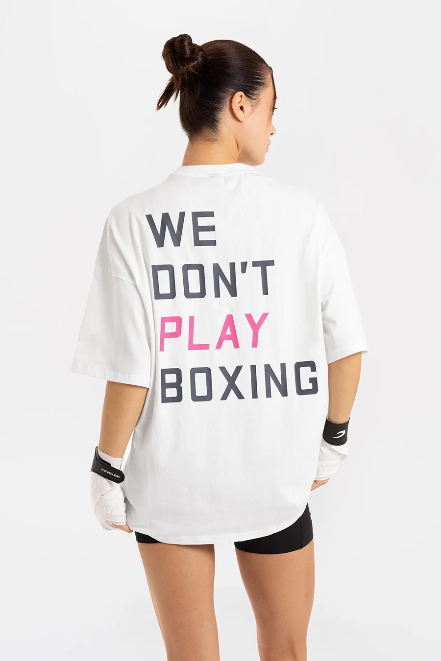 Самый жестокий из видов спорта. Вредный бизнес. У бокса много ярлыков. Но в сообществе хорошо известно, что вы можете играть в футбол, баскетбол и другие виды спорта, но вы не можете играть в бокс. Эта футболка кроя оверсайз с нашим фирменным слоганом WE DON'T PLAY BOXING ®️ на спине служит напоминанием миру об этом факте и сопровождает вас на протяжении раундов день за днем.