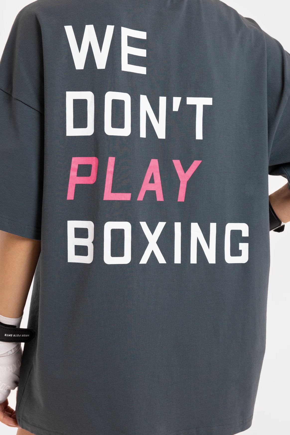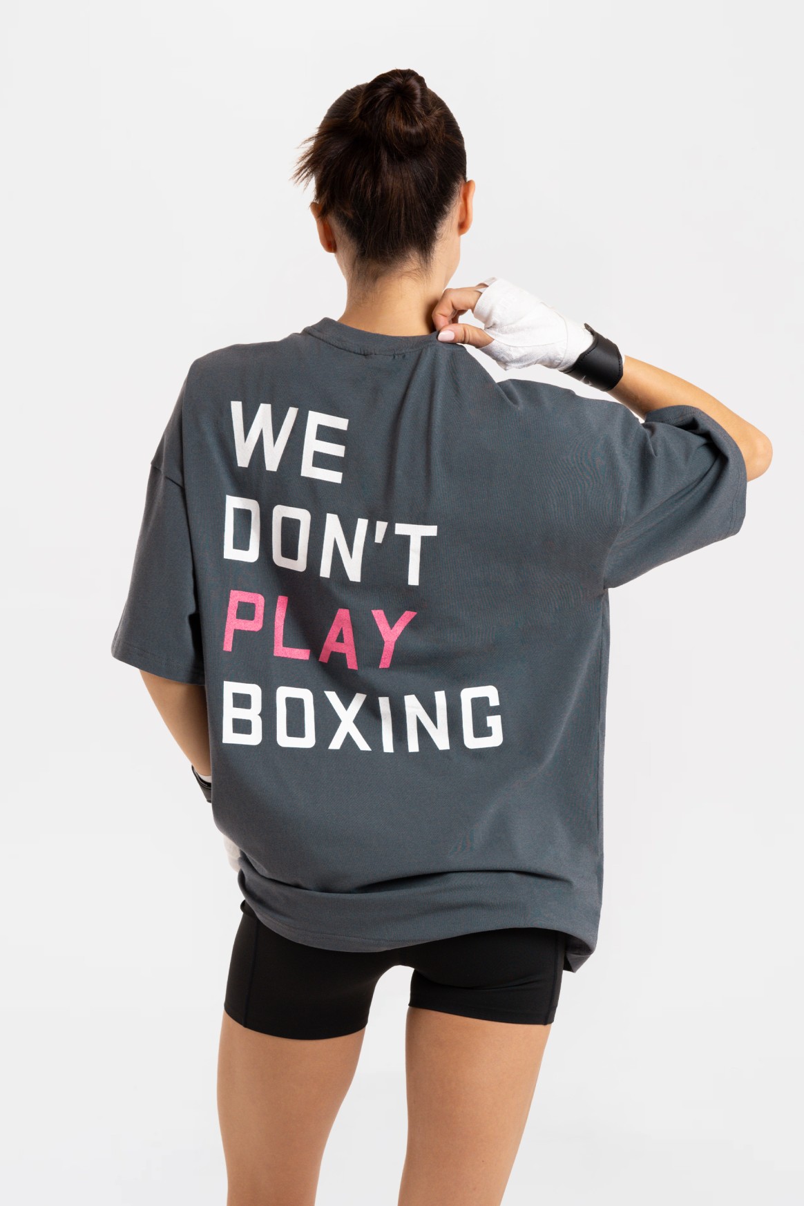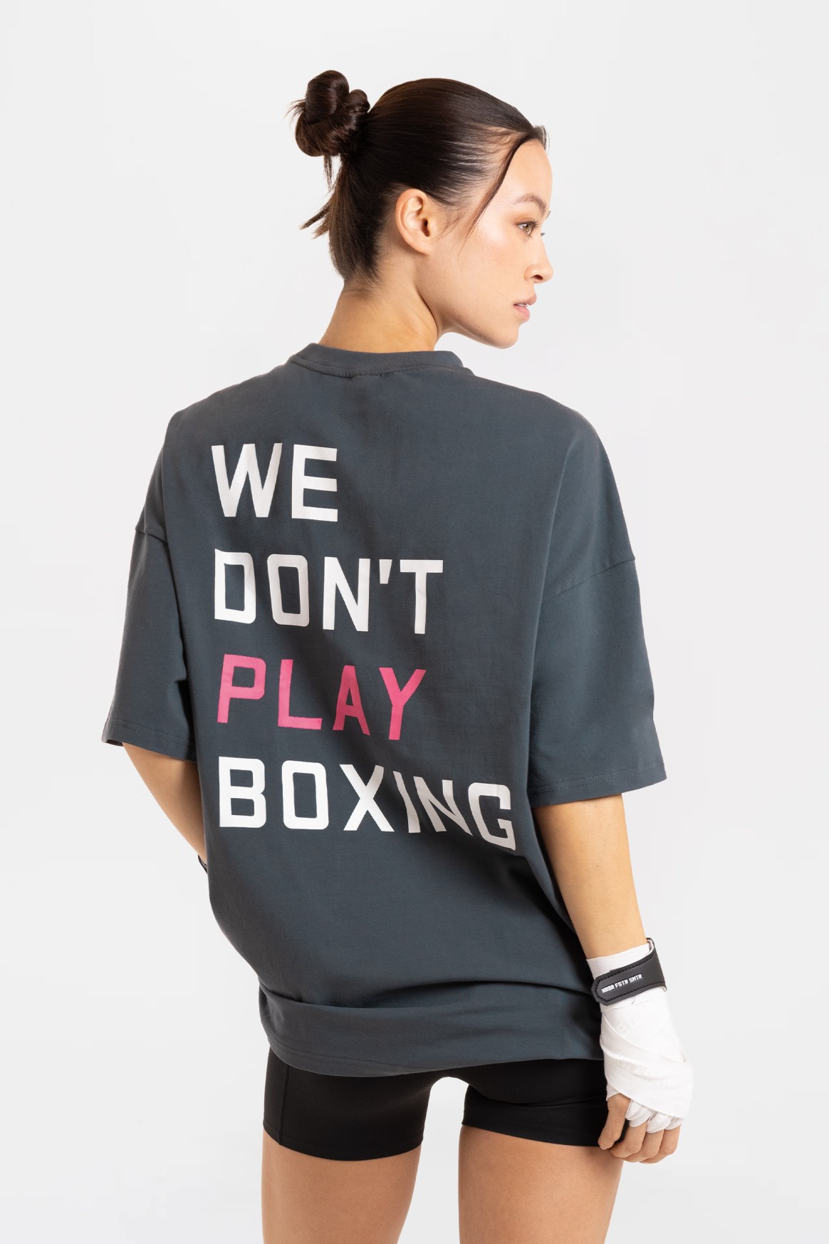 Самый жестокий из видов спорта. Вредный бизнес. У бокса много ярлыков. Но в сообществе хорошо известно, что вы можете играть в футбол, баскетбол и другие виды спорта, но вы не можете играть в бокс. Эта футболка кроя оверсайз с нашим фирменным слоганом WE DON'T PLAY BOXING ®️ на спине служит напоминанием миру об этом факте и сопровождает вас на протяжении раундов день за днем.