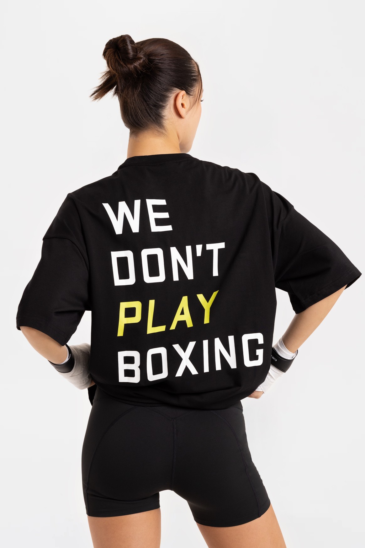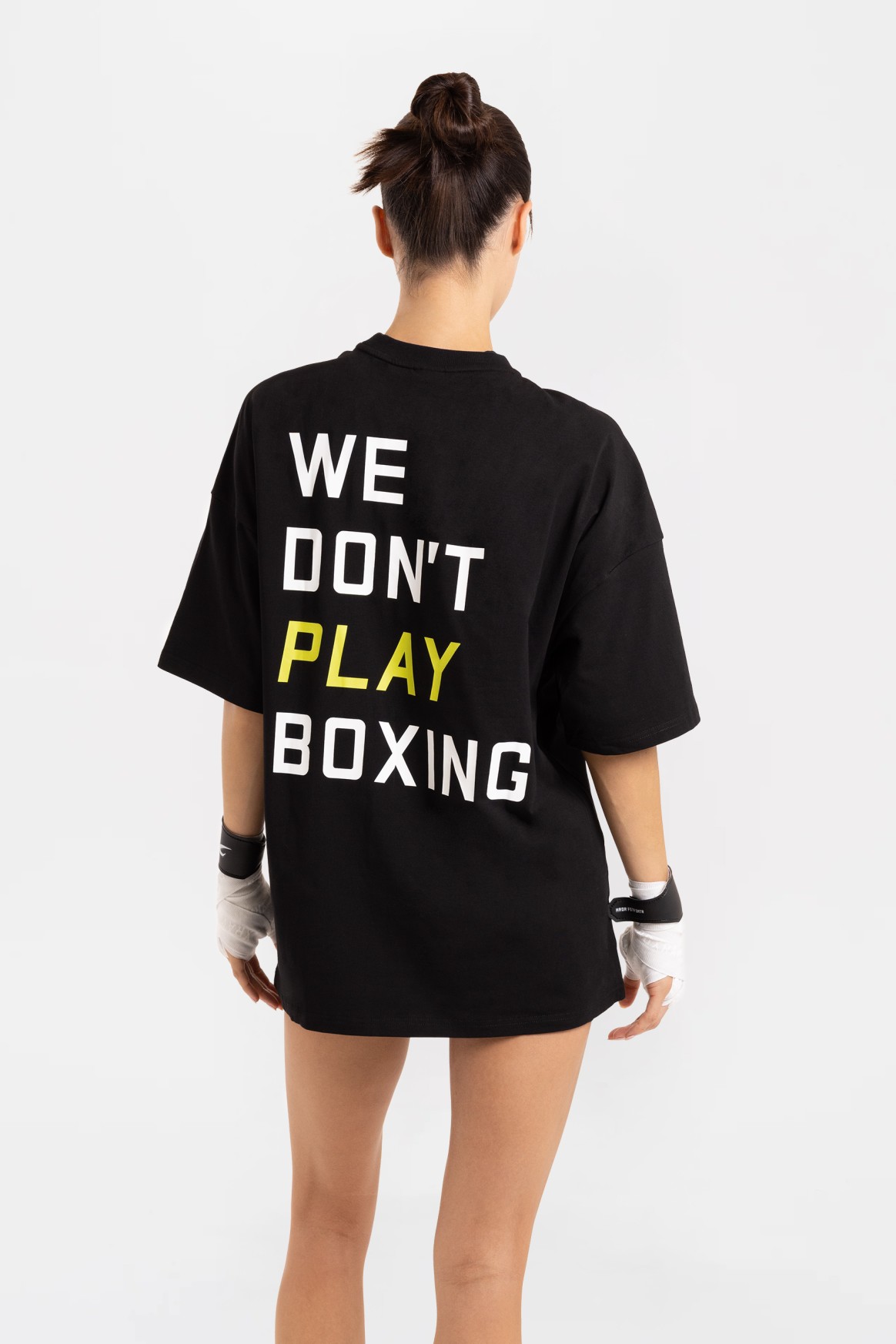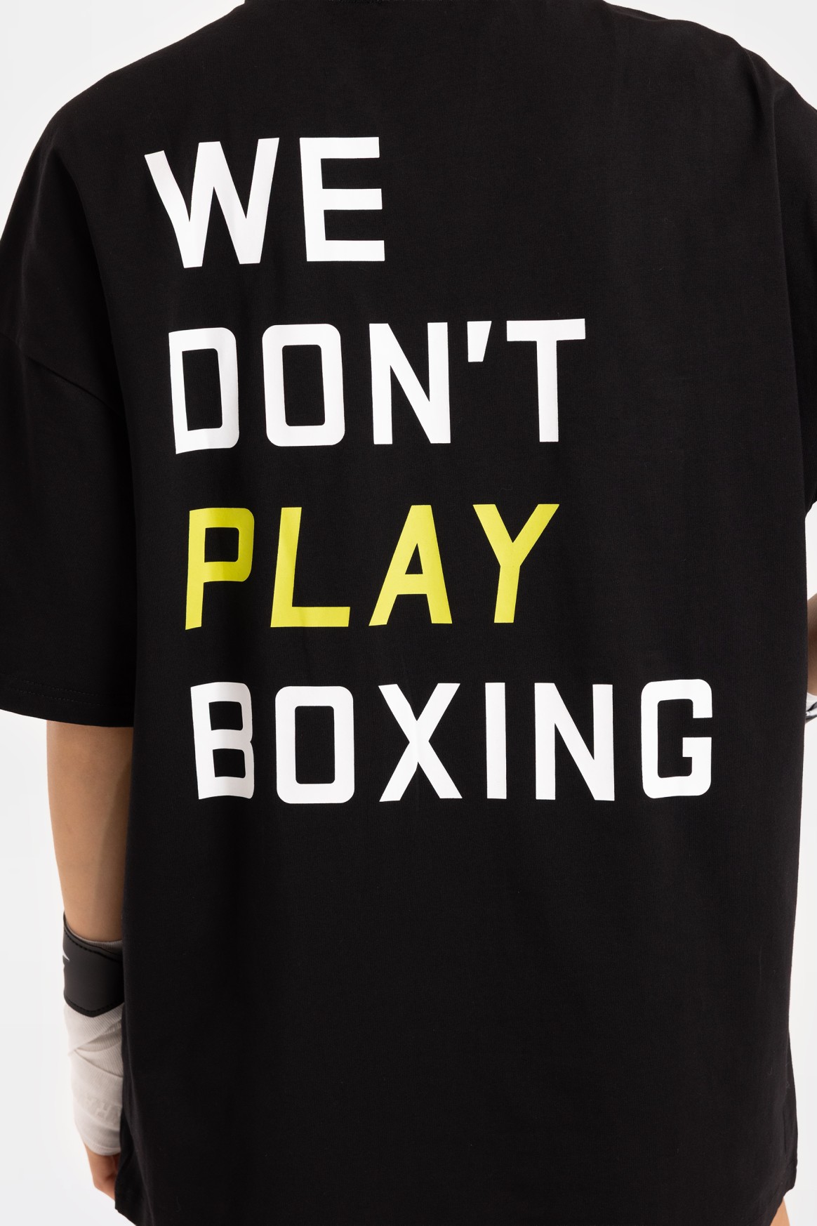 Самый жестокий из видов спорта. Вредный бизнес. У бокса много ярлыков. Но в сообществе хорошо известно, что вы можете играть в футбол, баскетбол и другие виды спорта, но вы не можете играть в бокс. Эта футболка кроя оверсайз с нашим фирменным слоганом WE DON'T PLAY BOXING ®️ на спине служит напоминанием миру об этом факте и сопровождает вас на протяжении раундов день за днем.